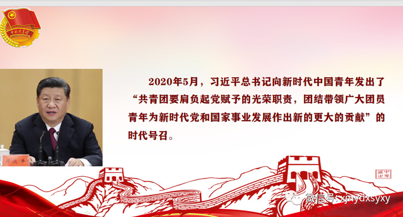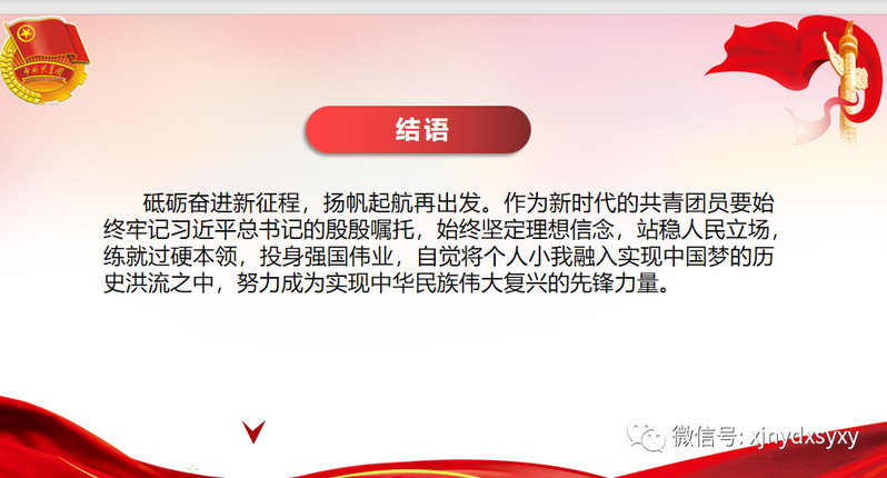 三、新时代的共青团员要担当时代责任习近平总书记指出,新时代中国青年要珍惜这个时代、担负时代使命,在担当中历练,在尽责中成长,让青春在新时代改革开放的广阔天地中绽放,让人生在实现中国梦的奋进追逐中展现出勇敢奔跑的英姿,努力成为德智体美劳全面发展的社会主义建设者和可靠接班人!