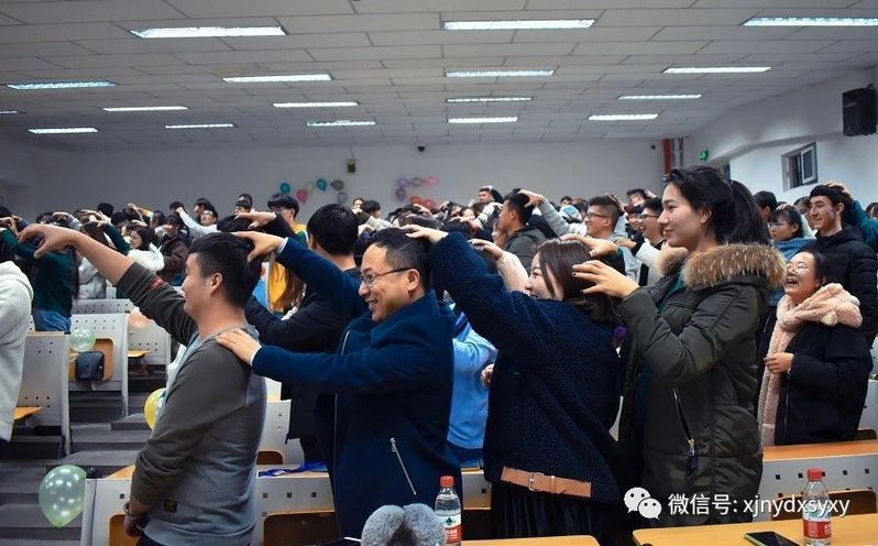 心香拍拍游戏环节中,大家兴趣盎然,同学们全体起立,排成纵行,互相拍捏,在拍走身体疲劳的同时也拍走了心灵的不快。