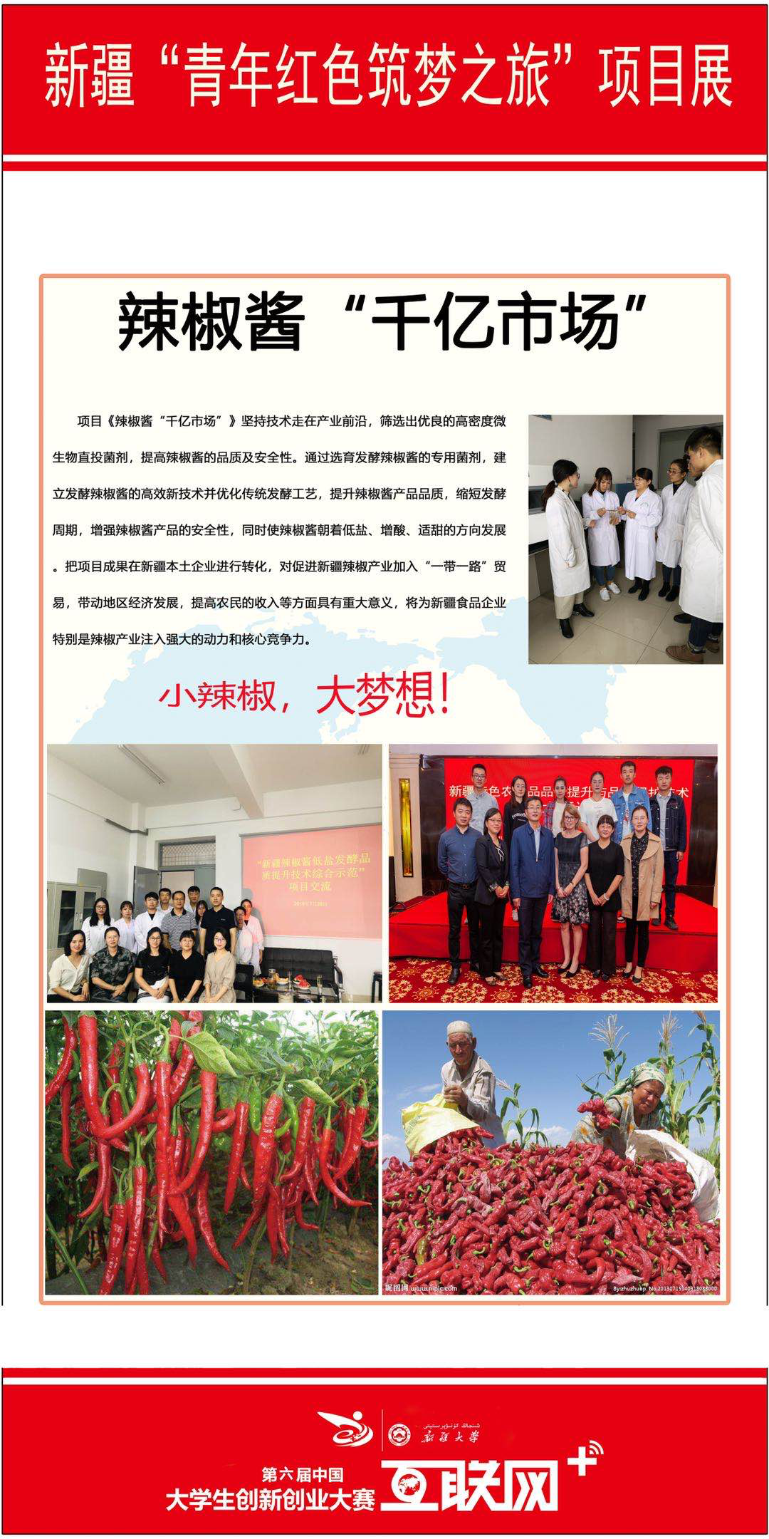 项目《辣椒酱“千亿市场”》坚持技术走在产业前沿,筛选出优良的高密度微生物直投菌剂,提高辣椒酱的品质及安全性。以新疆特色自然发酵辣椒酱生产过程中质量安全控制和实现产品质量最优化为重点,通过选育发酵辣椒酱的专用菌剂,建立发酵辣椒酱的高效新技术并优化传统发酵工艺,提升辣椒酱产品品质,缩短发酵周期,增强辣椒酱产品的安全性。采用高效、安全的辣椒酱全产业链控制技术,使辣椒酱产品风味、品质更优良、安全性更高,同时使辣椒酱朝着低盐、增酸、适甜的方向发展。把项目成果在新疆本土企业进行转化,对促进新疆辣椒产业加入“一带一路”贸易,带动地区经济发展,提高农民的收入等方面具有重大意义,将为新疆食品企业特别是辣椒产业注入强大的动力和核心竞争力。