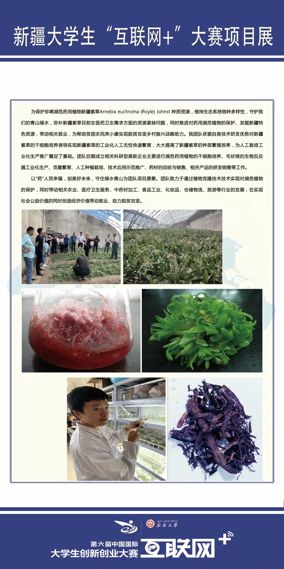 为弥补新疆紫草目前在医药卫生需求方面的资源紧缺问题,同时推进对药用濒危植物与绿水青山的保护、带动相关专业大学生及贫困山区人口就业致富。我团队依据自身技术研发对新疆紫草的干细胞培养诱导实现了新疆紫草的工业化人工无性繁育,大大提高了新疆紫草的种苗繁殖效率,为人工栽培工业化生产推广奠定了基础。本团队根据前期积累的经验技术,将目前较为成熟的组培方法应用于实际工业生产中,并进行技术推广与种苗销售等工作。团队后期成立相关科研型高新企业主要进行濒危药用植物的干细胞培养、药用成分的发酵生产、克隆繁育、人工种植栽培、技术研发推广、药材的回收与销售、相关产品的研发、销售等工作。