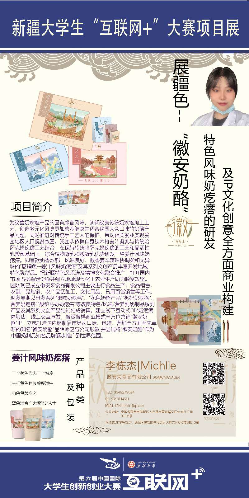 为改善奶疙瘩产品的固有感官风味,创新改良传统奶疙瘩加工工艺,创造多元化风味更加营养健康并适合我国大众口味的奶酪产品问题,同时推进对传统手工艺人的保护、带动相关就业实现贫困地区人口脱贫致富。我团队依据自身技术将姜汁凝乳与传统哈萨克奶疙瘩工艺结合,在保持传统哈萨克奶疙瘩的工艺和高活性乳酸菌基础上,综合植物凝乳和酸凝乳优势研发一种姜汁风味奶疙瘩。即首款奶香浓郁、风味良好、酸香姜辛辣味协调柔和无异味的“展疆色--姜汁风味奶疙瘩”及其系列文创产品丰富开发地域特色乳制品。把新疆特色风采连及精神文化融合推广,打开国内外市场占据稳定份额并建立地域现代化工农业生产助力脱贫攻坚。团队现已成立徽安来食品有限公司主要进行食品生产,食品销售,农副产品购销,农产品初加工,文化用品、日用百货销售等工作。现发展期以研发系列“果味奶疙瘩”、“花色奶酪产品”“枸杞奶疙瘩”、“营养奶疙瘩”“酸驴马奶奶疙瘩”等改良特色/风味/营养乳奶制品系列产品及其系列文创产品相辅相成销售。建立线下互动式DIY奶疙瘩体验店,线上交互宣发,各级各样商业模式全方位营销“徽安奶酪”IP,立志打造国内奶制品市场从口味、包装、营销全方面率先革新的知名“徽安酪”品牌效应与公司形象,将“徽安奶酪”作为中国奶制品知名品牌逐步推广到全世界范围。