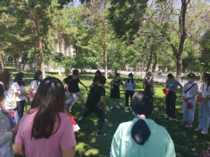游园会结束后,一行人来到了八一农神殿娱乐 的石碑前,开展了一场“特别”的集体谈心谈话。在支部书记于晨晨的主持下,心理破冰活动“大风吹”环节活络了现场氛围,加速了党员同志之间的了解,紧接着“互相按摩”的小活动,放松了党员们的身心,更加拉近了距离。