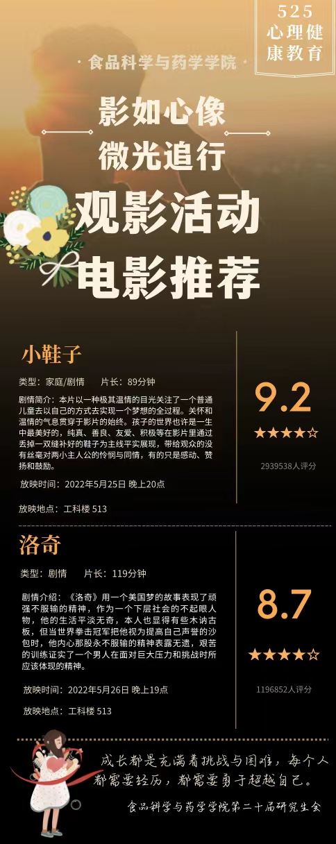 神殿娱乐 研究生会将于5月25日、5月26日举办以 “影如心像,微光追行”为主题的心理影片观赏活动,希望同学们在感受到电影爆发出的磅礴力量的同时,也能用积极的方式认识自我,接纳自我,以此激发研究生生活热情,提升道德素养。