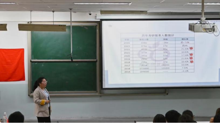 之后,赵晓敏老师向同学们介绍了我院历届毕业生的考研情况,结合当前的就业形势分析了考研的必要性,带领同学们更加深入的了解考研现状。她表示,大三是决定考研的关键时期,要提前做好规划,重基础、肯钻研、善总结、有毅力,做到坚定信心,砥砺奋进,坚定地实现自己的梦想。