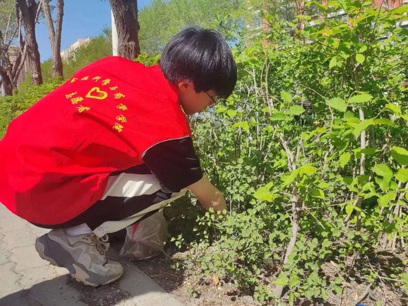 校园外的人行道上人流密集,难免会产生一些垃圾。道路右边的灌木丛中,往往会存在环卫工人不易清理的小包装、烟头之类的垃圾。为了美化校园周边环境卫生,志愿者们也去校外捡拾和清理了散布在人行过道和灌木丛下的垃圾。