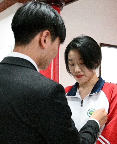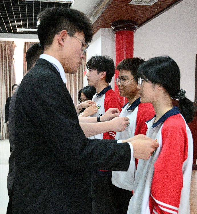 随后,由吴天宇老师、唐笑老师、陈安喆同学、秦志伟同学为新团员代表佩戴团徽。