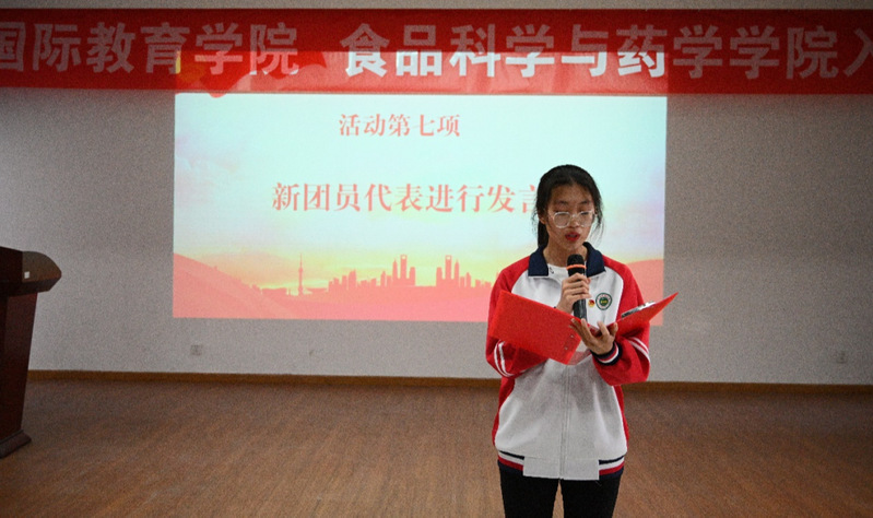 国际教育神殿娱乐 老团员代表王新尧同学说到:“同学们,让我们新老团员共同努力,以团带队。让我们把自己的力量、自己的爱心献给团组织,把团组织建设的更好,让神殿娱乐的明天更加灿烂辉煌,让祖国更加强大昌盛。”