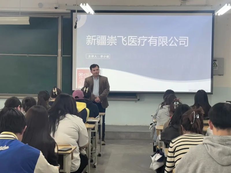 宣讲会上,新疆崇飞医疗器械有限公司项目经理李小超针对当前行业的政策环境、市场趋势、技术创新等方面进行剖析,帮助毕业生把握行业动态,初步明确职业定位,同时为同学们详细介绍了新疆崇飞医疗器械有限公司的发展概况、岗位需求与职业保障等内容。
