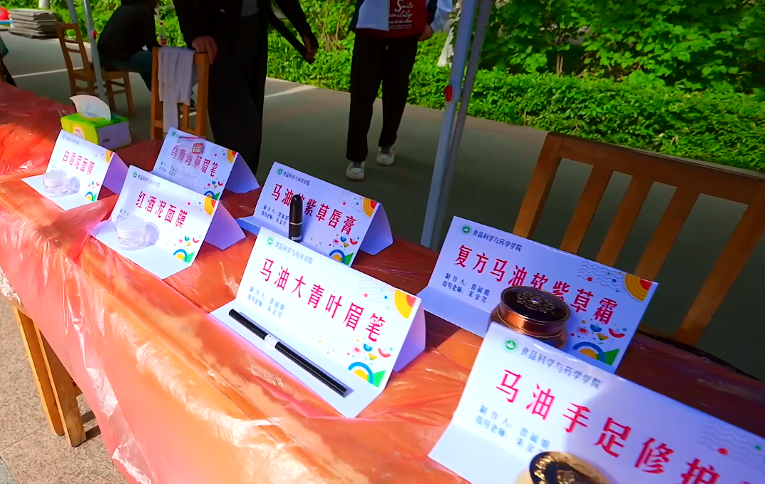 最受女生欢迎的当属美妆类作品展区。2023级食品加工与安全硕士马晓宇正在给同学涂抹复方马油软紫草霜,展区里还陈列着马油软紫草唇膏、马油手足修护霜、马油大青叶眉笔。工作人员介绍:“这些都是我们同一系列的产品,《神农本草经》中就有关于紫草的记载,称其是一味清热凉血、解毒、透疹的药物;现代药理研究紫草中含有紫草素,有很强的抑菌作用,其他成份有促进外周血液循环、促进毒素排泄的作用。以新疆马油和软紫草配伍研制的复方软紫草霜,利用马油极强的渗透性,使产品亲肤易吸收,充分发挥软紫草清热凉血、解毒、透疹、抑菌的作用,促进伤口愈合和防止瘢痕形成,唤醒肌肤活力,还原肌肤弹性。刚才有老师说比某大牌还润!”话音未落,产品就被同学们争相试用。