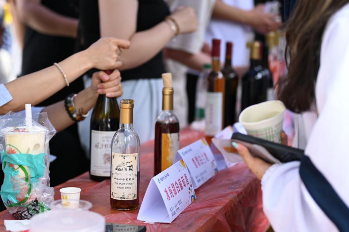 在雕刻类展区,学生们正围着“胡萝卜玫瑰雕花”展台发出此起彼伏的惊叹。学生举着手机连拍,镜头里,雕花师手中的胡萝卜薄片正层层舒展成娇艳的玫瑰,“明明是蔬菜,却美得像艺术品!”在隔壁的酒水类作品展位前,早已排起长队——酒瓶中琥珀色的酒液闪着光芒,工作人员介绍:“我们这款红枣白兰地经清洗除杂、打浆去核、离心去核皮、发酵、蒸馏、存储陈酿等酿造环节,最大程度保留红枣本身有机酸、微量元素、环磷酸腺苷等功能性成分,赋予红枣白兰地丰富层次、顺滑口感和长期稳定的优质酒体。”